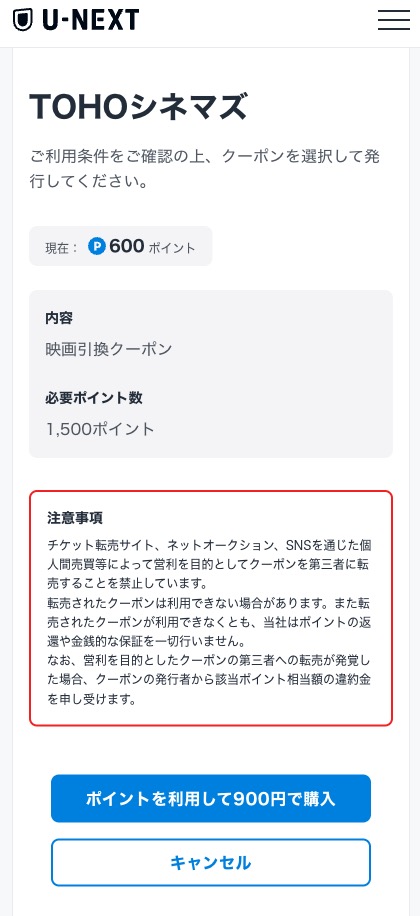 U-NEXTの映画チケットは1,500ポイントで交換できますが、映画館の当日料金が1,300円などの場合でも差額は返金されません。